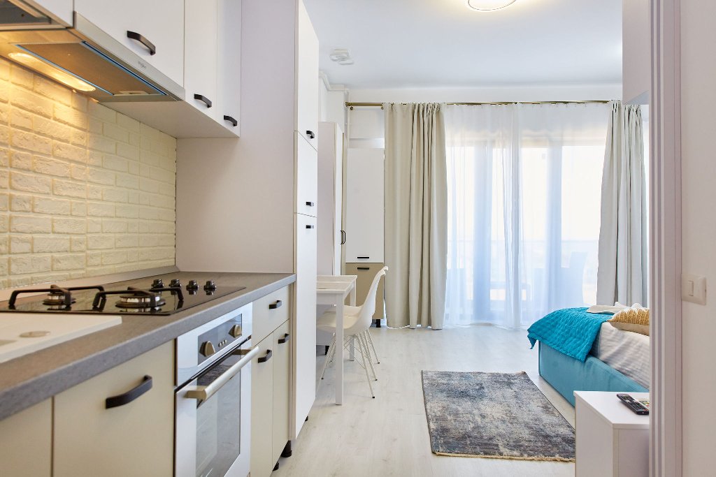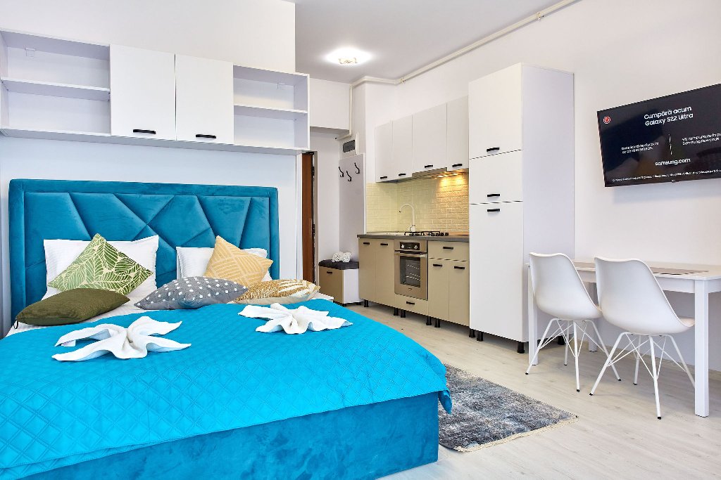 Camere: Apartamentele si studiourile sunt dotate cu pat matrimonial, canapea extensibila, 2 smart tv, internet wi-fi , aer conditionat, baie privata si bucatarie mobilata si utilata cu electrocasnice si electronice noi.