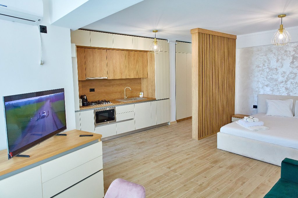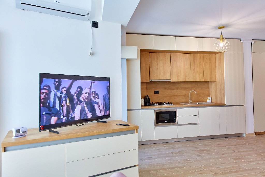 Studioul dispune de un smart tv,bucatarie mobilata si utilata cu electronice si electrocasnice noi,sporind astfel confortul casei cat si ale turistilor care ne trec pragul.