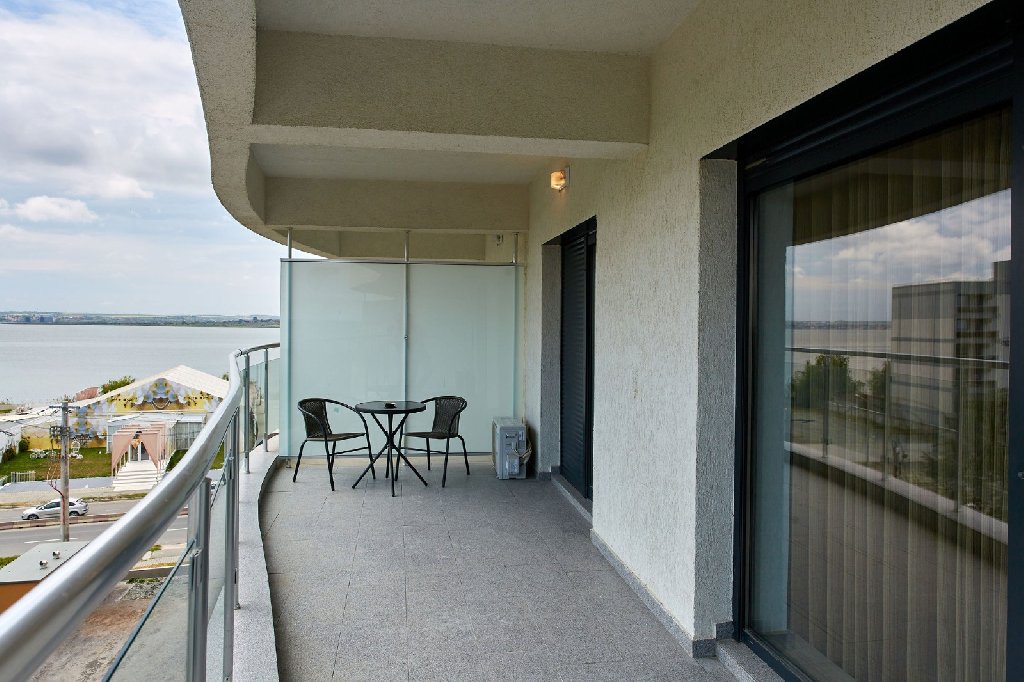 Apartament Moonlight: dormitor cu pat matrimonial, living cu canapea extensibila cu open space cu zona de gatit si de servit masa, TV Smart, sistem climatizare, bucatarie utilata cu electrocasnice modern (cuptor, plita, cuptor cu microunde, aparat de cafea, frigider), baie cu cabina de dus de tip walk in, balcon cu masuta si scaune, cu vedere partiala atat la mare cat si la lac. Suprafata 55 mp.