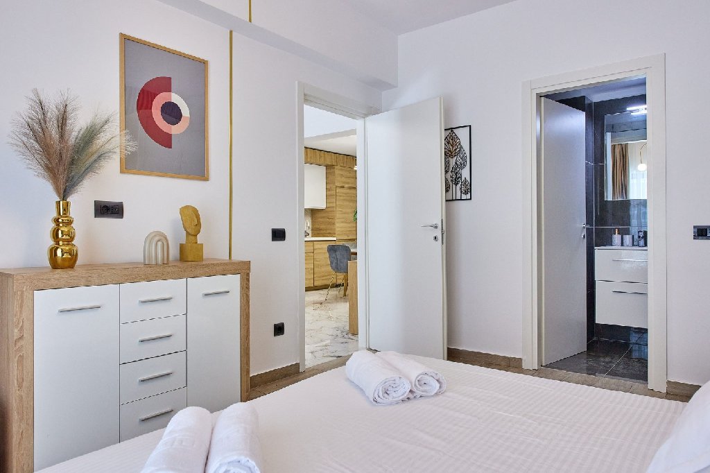 Elite Beachfront: dormitor cu pat matrimonial, living open space cu canapea extensibila, zona de servit masa, bucatarie dotata cu plita, cuptor, fierbator, aragaz, TV smart in ambele camere, aer conditionat. Este deservit de 2 bai, una de servicii si una cu cabina de dus de tip walk in, balcon cu mobilier, vedere la mare. Suprafata 55 mp.