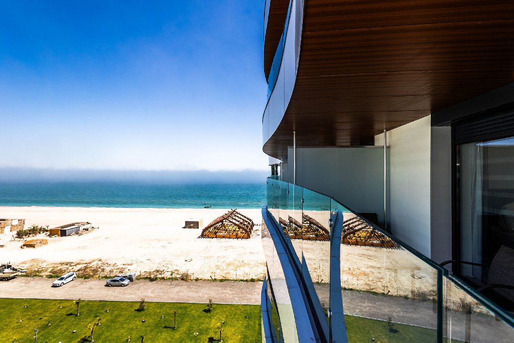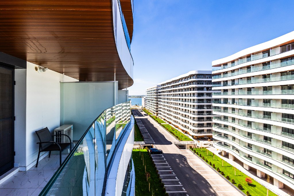 Studio-ul dispune de un balcon privat cu vedere panoramica la mare, dar si o deschidere laterala spre lac, oferind un cadru ideal pentru relaxare dimineata sau seara, intr-o atmosfera linistita.