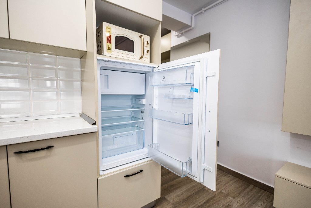 Mobilata in tonuri bej cald, bucataria este complet utilata si perfect integrata in spatiu. Este dotata cu plita electrica, frigider, cuptor cu microunde, prajitor de paine, aparat de cafea, fierbator de apa si vesela completa, oferind toate conditiile necesare pentru gatit si servit masa in confortul propriu.