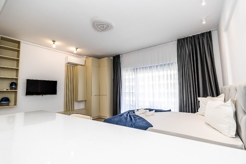 Studio-ul este amenajat cu un pat matrimonial cu tapiterie gri, amplasat central si orientat catre un televizor smart. Spatiul este luminos si aerisit, cu un dulap generos, perfect pentru o sedere indelungata sau pentru depozitarea organizata a bagajelor.