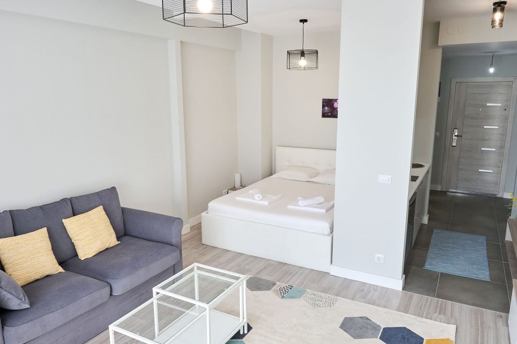 Studio Selena Onix Blue cu o suprafata de 37 mp este dotat cu un pat matrimonial Cai canapea extensibila, bucatarie mobilata si utilata cu electronice si electrocasnice noi, maCaina de splat rufe, baie cu cabina de dus, TV, internet, aer condiCaionat . Adresa: strada D 25 , nr.5 , Bl B 4, et. 4.