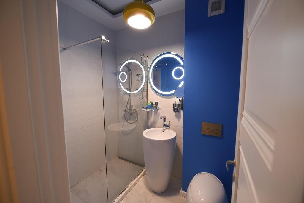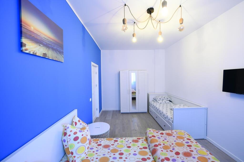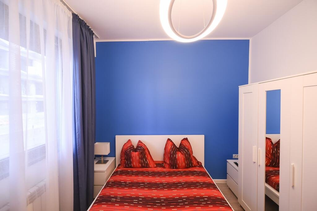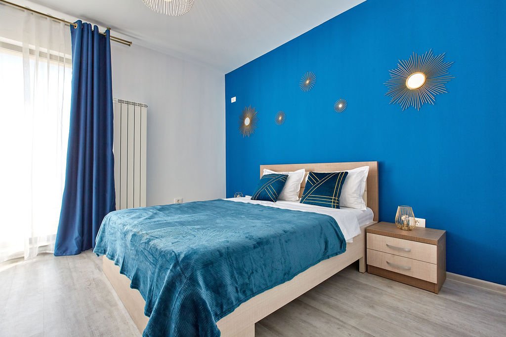 Apartament Blue Promenada cu o suprafata de 55 mp este compus dintr-un dormitor cu pat matrimonial, living cu canapea extensibila, bucatarie dotata cu plita de gatit , cuptor cu microunde, aparat de cafea, frigider , vesela, TV, wi-fi, aer conditionat, baie cu cabina de dus si masina de spalat, balcon cu vedere frontala la mare. Adresa : strada Promenada 85 bis , et. 4