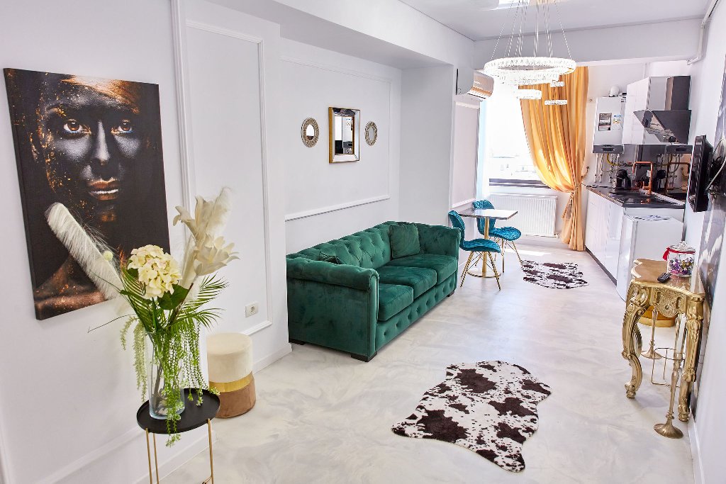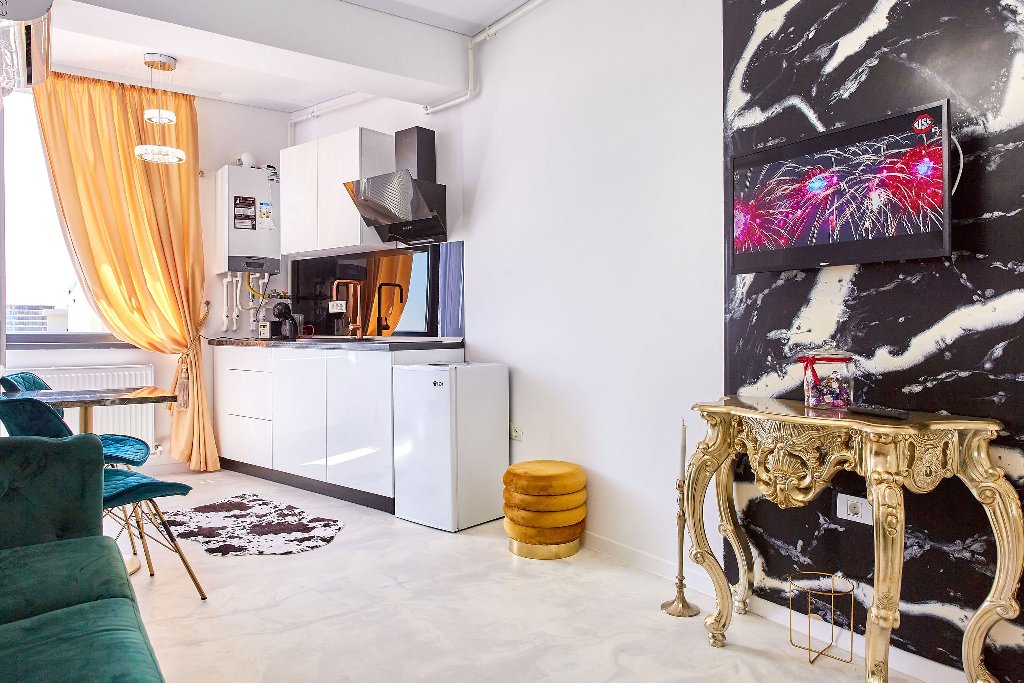 Apartament Gold House Stefan Resort este alcatuit din 2 camere si va pune la dispozitie pat matrimonial in dormitor, canapea extensibila in living, 2 smart TV, dressing, baie si bucatarie.