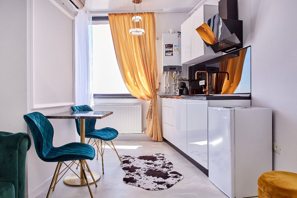 Studioul dispune de un smart tv,bucatarie mobilata si utilata cu electronice si electrocasnice noi,sporind astfel confortul casei cat si ale turistilor care ne trec pragul.