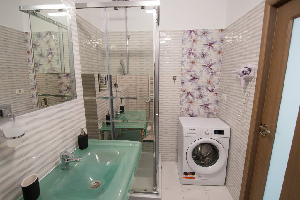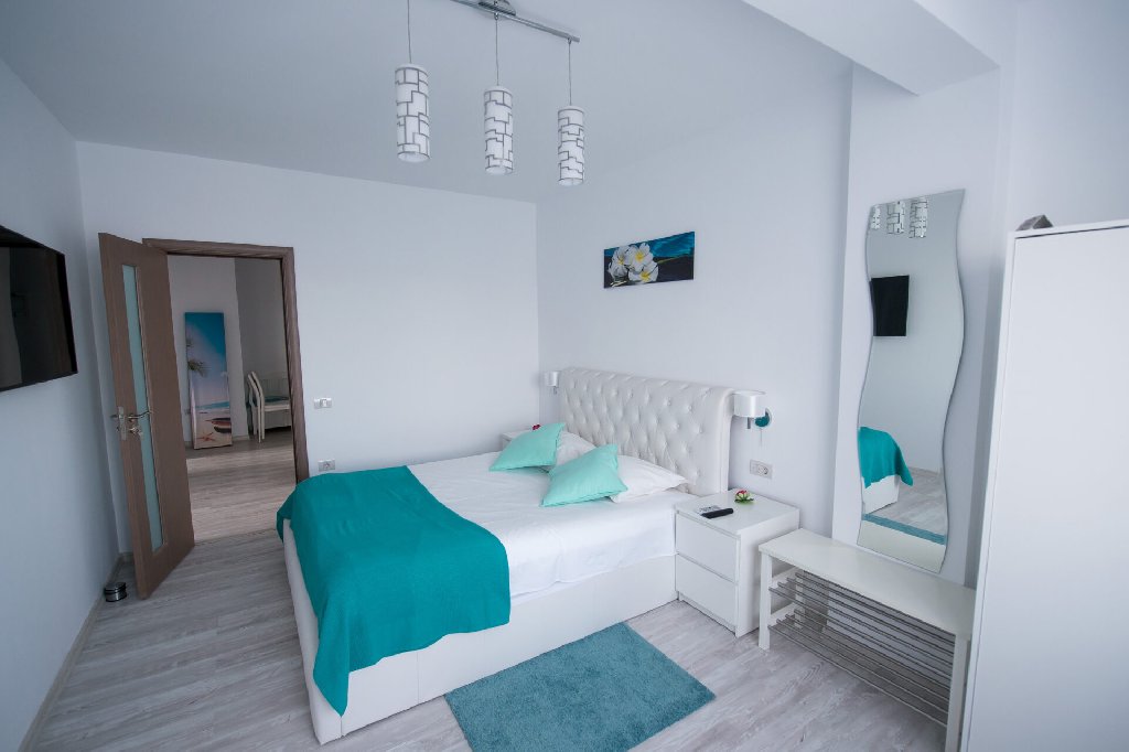 Apartamentul este complet mobilat si utilat modern. Dispune de un living cu canapea extensibila, un dormitor cu pat matrimonial si un dressing. Pentru confortul maxim al oaspetilor, fiecare camera este dotata cu aer conditionat, iar pentru divertisment, exista 2 smart TV-uri. Bucataria este complet utilata si include atat masina de spalat vase, cat si masina de spalat rufe. Baia este echipata cu o cabina de dus. De asemenea, se ofera conexiune Wi-Fi gratuita. Pentru a va bucura de privelistea catre mare, puteti savura momente relaxante pe terasa cu iesire din living.