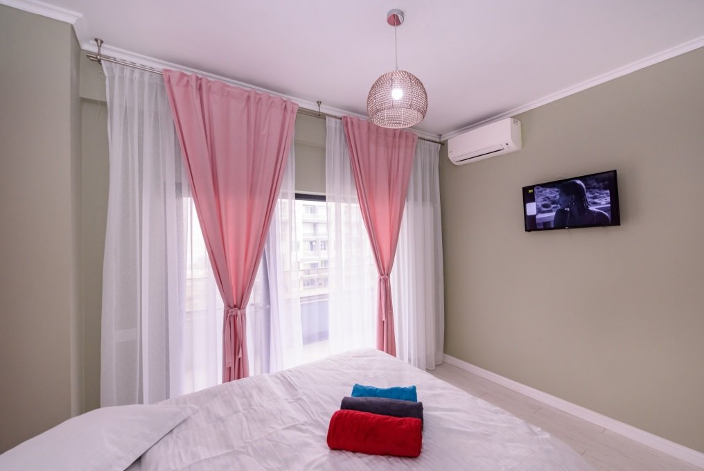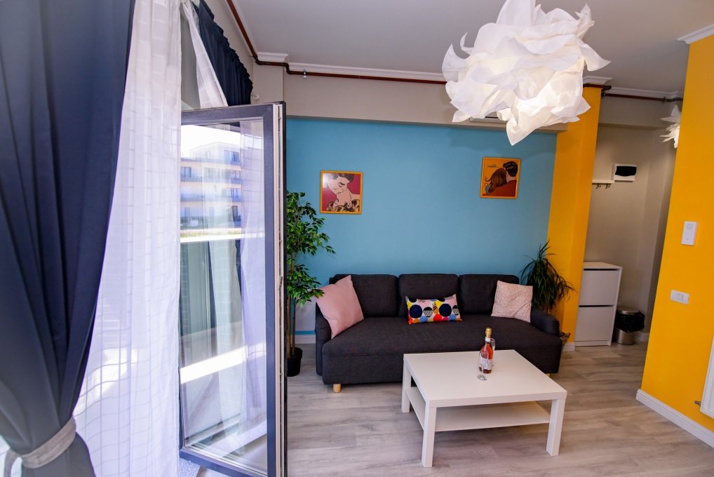 Apartamentul 308 - localizat la etajul 1, dispune de terasa cu masa si scaune, se compune din living cu canapea extensibila (160x200) cu loc de servit masa si dormitor cu pat matrimonial (160x200). Aer conditionat exista in living si TV in ambele camere. Suprafata 50 mp.