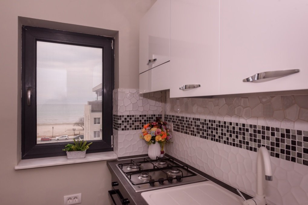 Apartamentul 323 e situat la etajul 3, dispune de terasa cu masa si scaune, are vedere frontala la mare si se compune din living cu canapea extensibila (160x200) cu loc de servit masa si dormitor cu pat matrimonial (160x200). Bucataria are si cuptor in dotare. Aer conditionat exista in living si TV in ambele camere. Suprafata 55 mp.