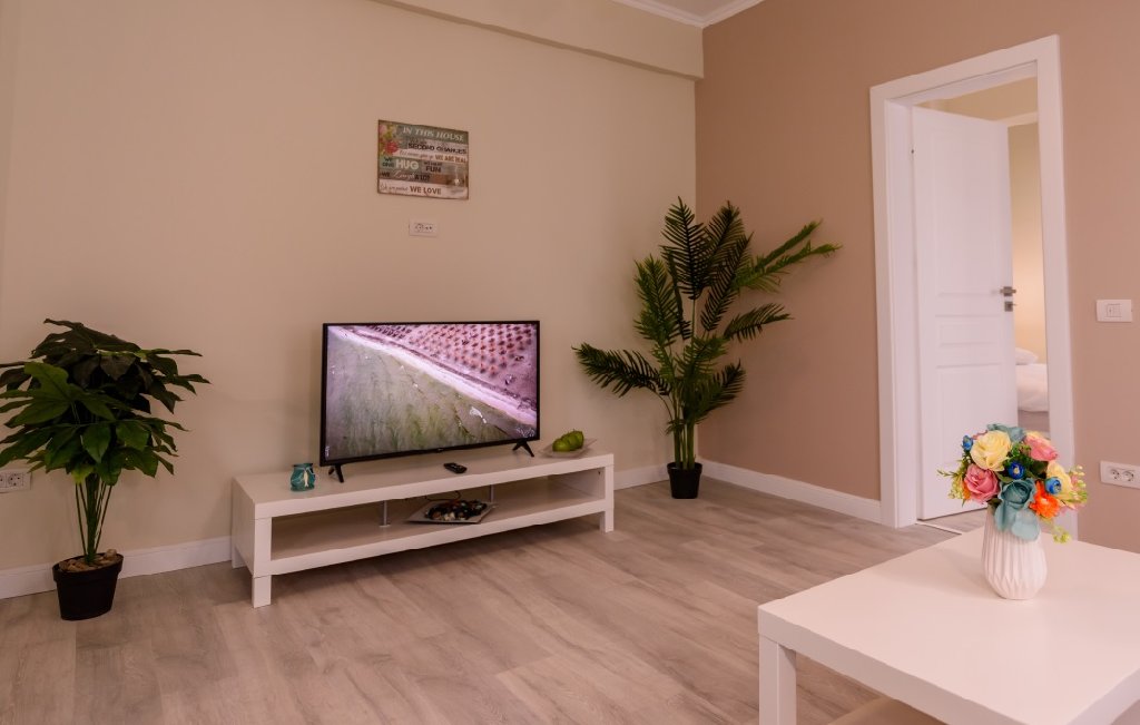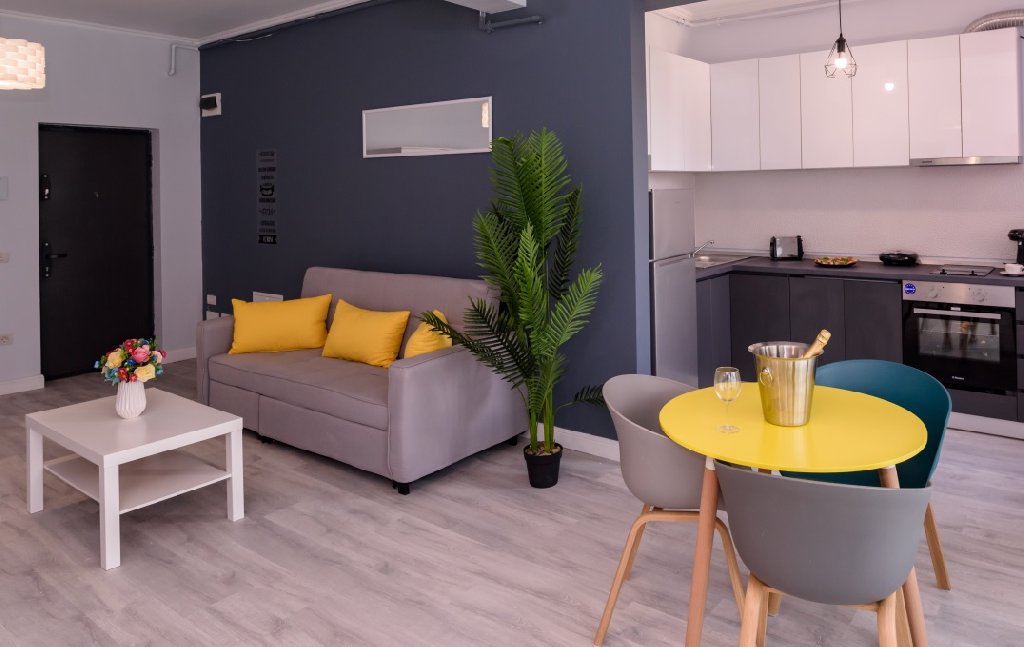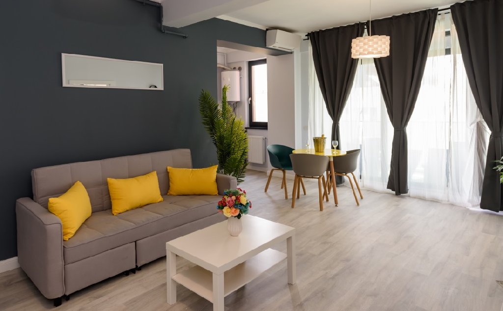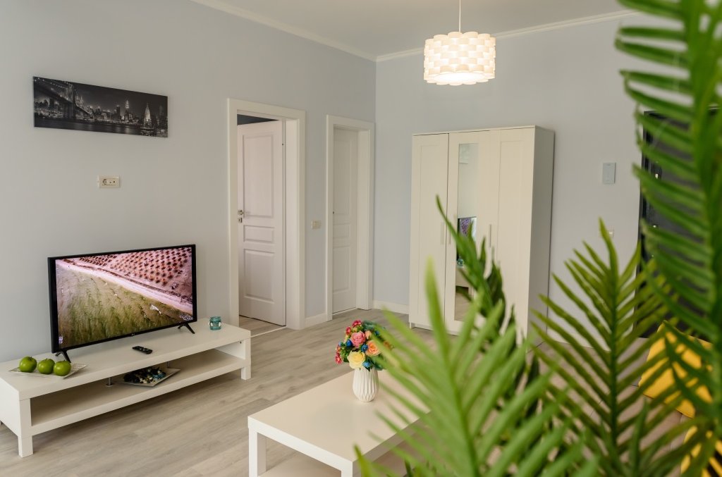 Apartamentul 605 - situat la etajul 1, dispune de terasa mobilata si se compune din living cu canapea extensibila (160x200), loc de luat masa, dormitor cu pat matrimonial (160x200), bucatarie si baie cu dus. In living exista aer conditionat si smart TV, iar in dormitor exista LED tv. Suprafata 48 mp.