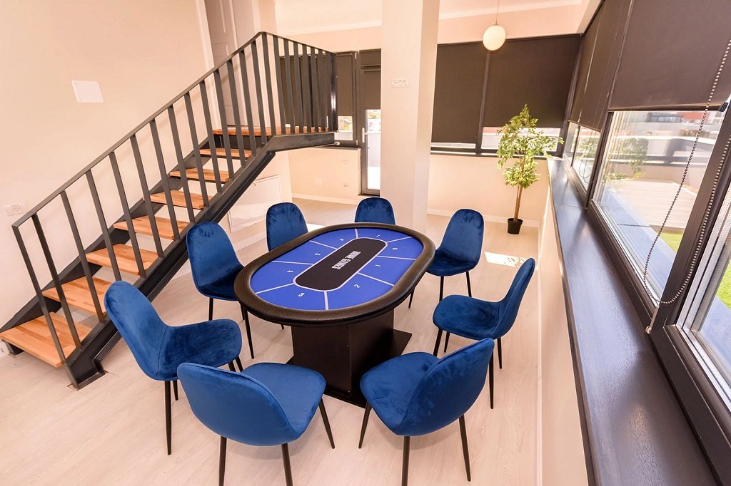 Apartamentul 611 - penthouse - este situat la etajele 3 si 4 si dispune de 5 terase mobilate (masa, scaune si jacuzzi). Pe etajul 3 se afla un living cu canapele fixe si loc de servit masa, trei dormitoare matrimoniale (160x200), bucatarie si 3 bai cu dus. Pe etajul 4 exista un living cu masa si scaune pentru jocuri de societate (sah, table, poker, rummy), un dormitor cu canapea extensibila (160x200), bucatarie si baie cu dus. Pe etajul 3, bucataria este dotata si cu cuptor, in bai exista uscator de par, in living este Smart tv cu diagonala de 140 cm, in timp ce in dormitoare exista Smart tv cu diagonala de 108 cm. Pe etajul 3, toate cele 4 camere dispun de aer conditionat, in timp ce la etajul 4, aer conditionat este doar in living. Livingul de la etajul 4 nu are TV, insa dormitorul este dotat cu Smart tv cu diagonala de 119 cm si consola Play station 4. Suprafata 320 mp.