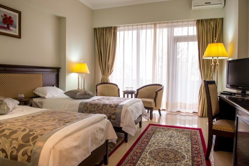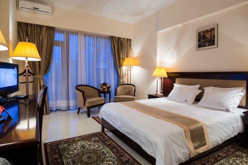 Camera dubla standard - are suprafata de 34 mp, pat queen size, terasa spatioasa (dotata cu masa si scaune), aer conditionat, minibar, seif, baie cu cabina de dus, uscator de par, fierbator, fier cu masa de calcat, doua telefoane, in camera si baie, TV, birou, internet, cosmetice hotel. Capacitatea maxima este de 2 adulti si 2 copii cu varsta cuprinsa intre 0-12 ani neimpliniti, poate fi adaugat un pat suplimentar la cerere.