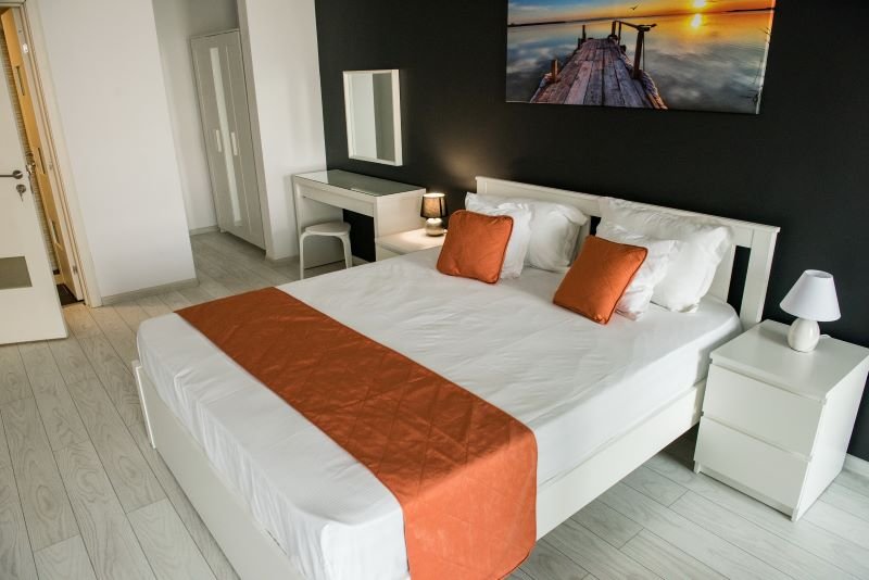Apartament Queen este compus din dormitor cu pat dublu cu dimensiunea de 1.60 / 2 m, 1 baie cu dus, living cu o canapea extensibila si bucatarie complet utilata, aerul conditionat si LCD tv sunt disponibile in ambele camere. Acest apartament are o terasa de 20 mp cu vedere superba catre lac. Apartamentul poate fi situat la etajul 3 sau la etajul 5 al cladirii. Suprafata 65 mp.