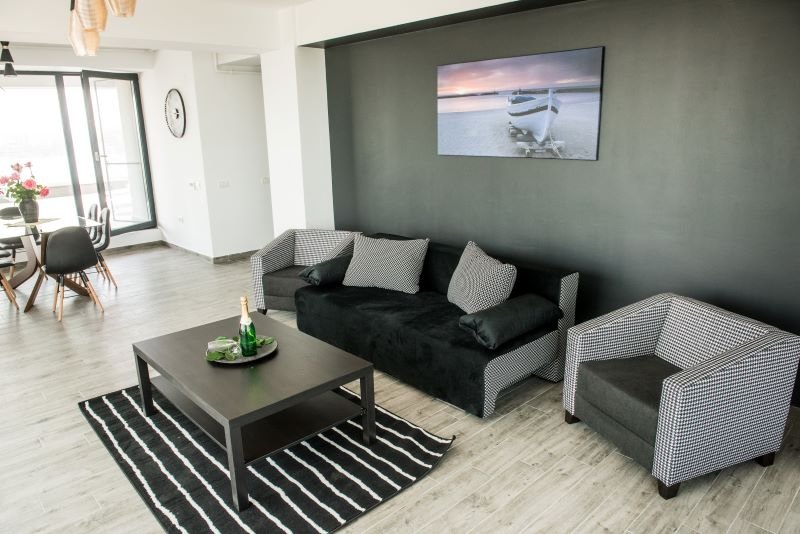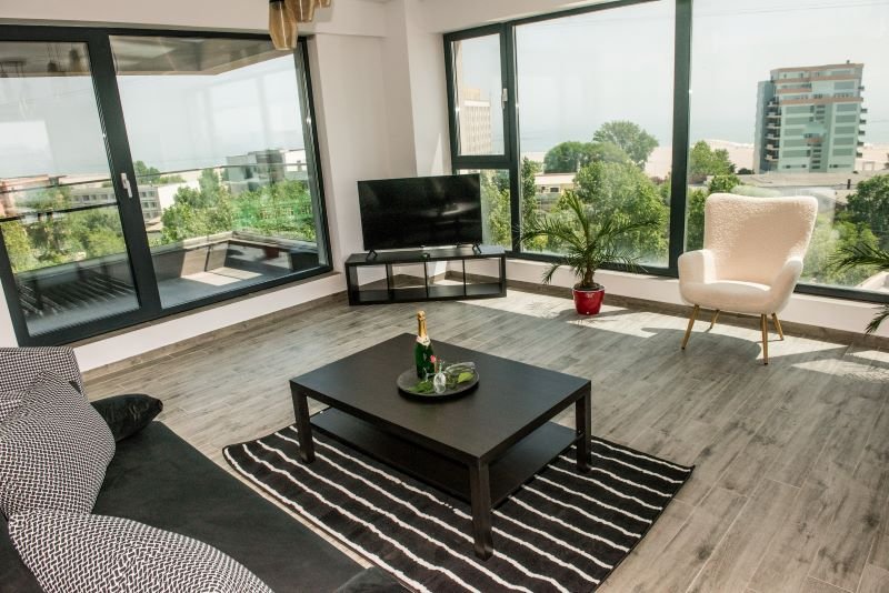 Apartament Penthouse este compus din dormitor cu pat dublu cu dimensiunea de 1.80 / 2 m, 2 bai (una cu dus, cealalta de serviciu), living cu o canapea extensibila si bucatarie complet utilata. Aer conditionat si LCD tv disponibile in amble camere. Acest apartament are doua terase de 50 mp cu vedere superba spre lac si catre mare. Apartamentul este situat la etajul 7 al cladirii (Rooftop). Suprafata 75 mp.