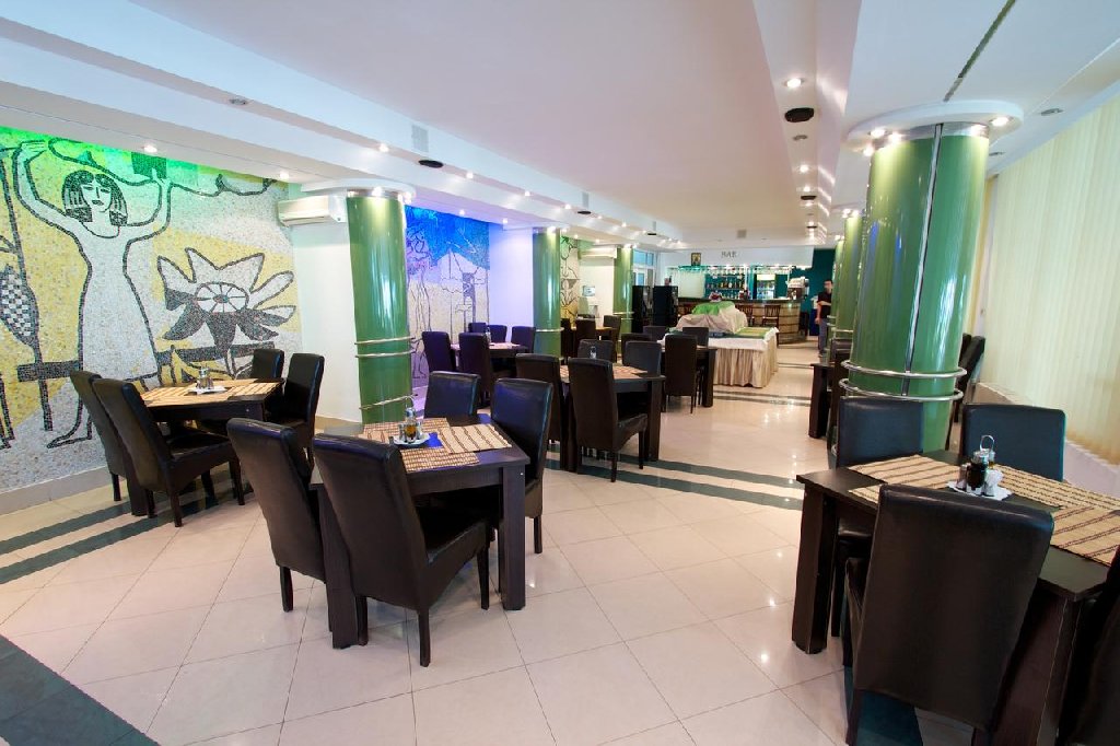 Restaurant propriu 3* cu o capacitate de 80 persoane in interior si 240 de persoane pe terasa; mic dejun- bufet suedez cu gustare rece si calda; pranz si cina- bucatarie romaneasca si internationala, terasa cu vedere spre mare, scaune pentru copii, spatiu de joaca amenajat langa terasa restaurantului.