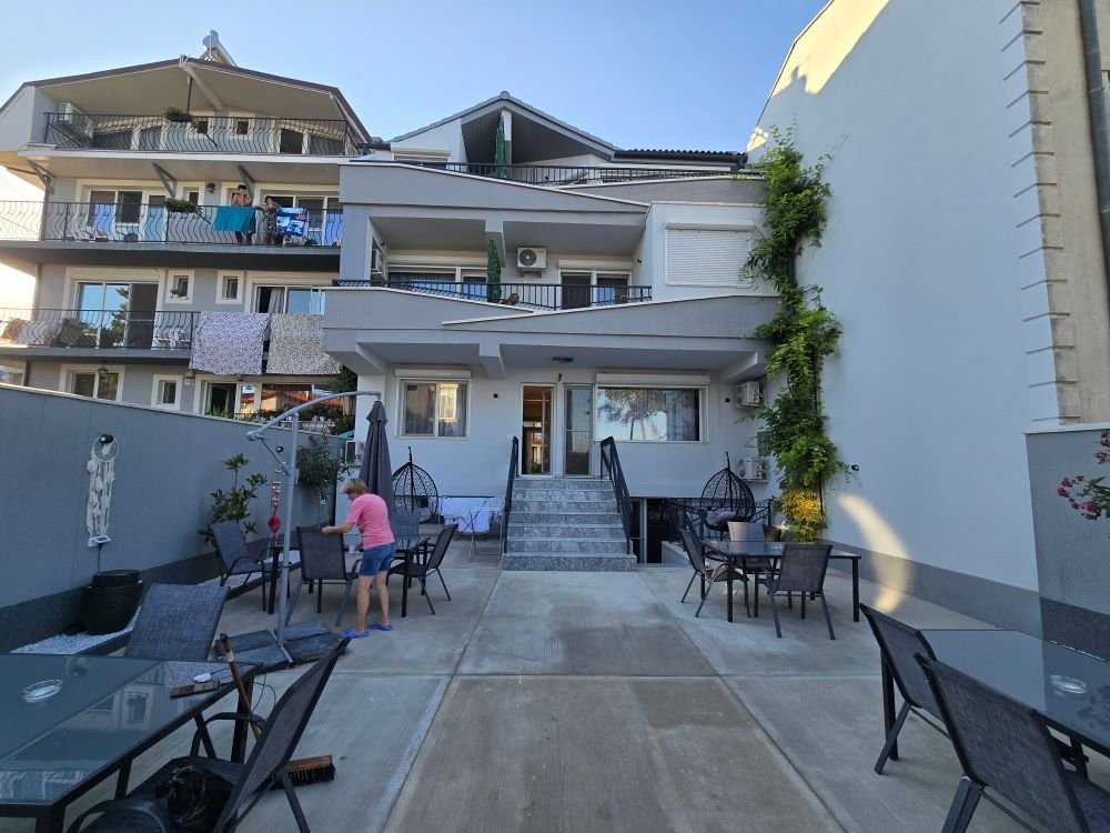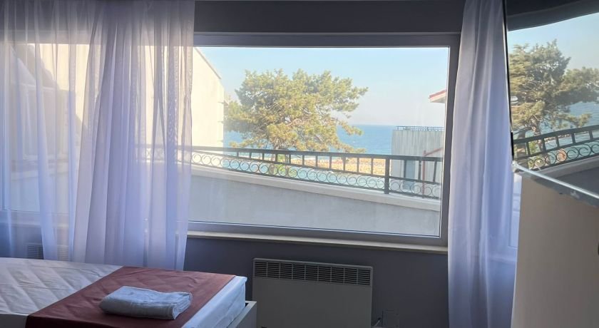 Apartamentul triplu cu doua dormitoare, terasa si vedere la mare dispune de doua dormitoare, fiecare cu pat matrimonial (180x200) si un pat single (90x200), terasa. Dormitoarele sunt separate cu usa si au fiecare tv si aer conditionat. Suprafata 60 mp