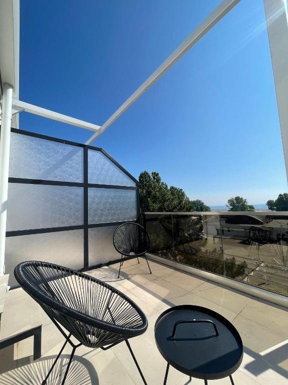 Suitele cu balcon au 32 mp si sunt dotate cu pat matrimonial, canapea extensibila si balcon.