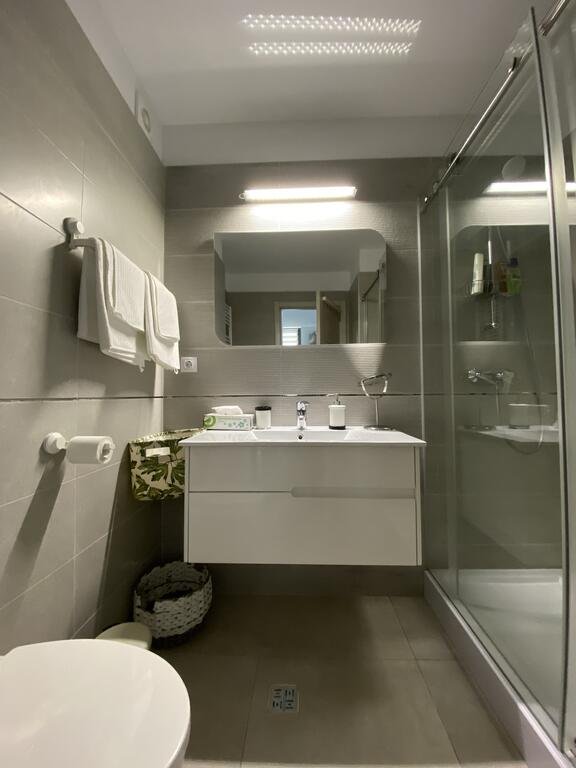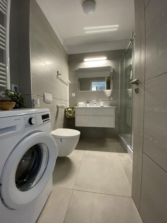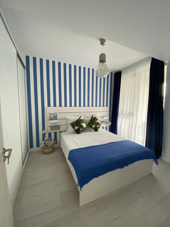 Apartamentul Nordic 81 este situat la etajul 6 si se compune din living cu canapea extensibila si cu bucatarie open space (dotata cu plita, frigider, microunde, filtru de cafea si masina de spalat rufe), dormitor cu pat matrimonial, separat cu usa, baie cu cabina de dus, balcon cu o masa si doua scaune, TV este disponibil in ambele camere, wi-fi, aer conditionat este disponibil doar in living. Suprafata 52 mp. Adresa : strada D25, nr 5, bloc B2, etaj 6, ap 81, Onix Blue.