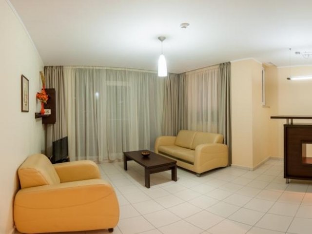 Studio cu balcon: este compus dintr-un living si un dormitor, despartite printr-un hol. Are vedere atat catre lac, cat si catre statiune. Este dotat cu aer conditionat, incalzire, TV, minibar, canapea extensibila si balcon. Include baie privata cu dus sau cada, uscator de par, articole de toaleta, halat de baie si papuci. Studiorile sunt situate la etajele I si IV accesibile cu liftul.