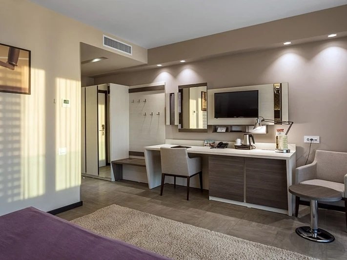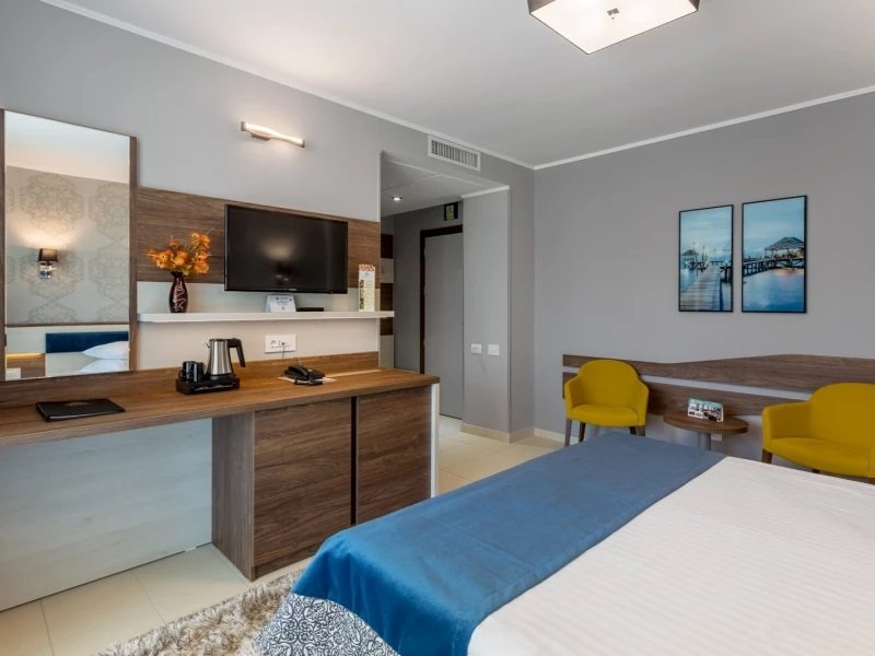 Camerele standard vedere statiune: dispun de pat matrimonial sau doua paturi single ce se pot uni, balcon, aer conditionat, incalzire, birou, TV, minibar. Acestea includ baie privata cu dus, uscator de par, articole de toaleta, halat de baie si papuci.