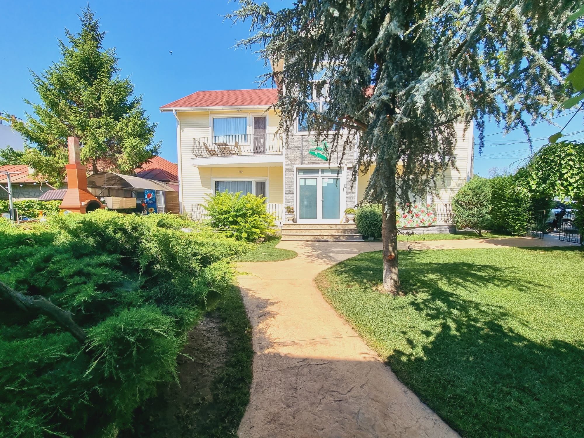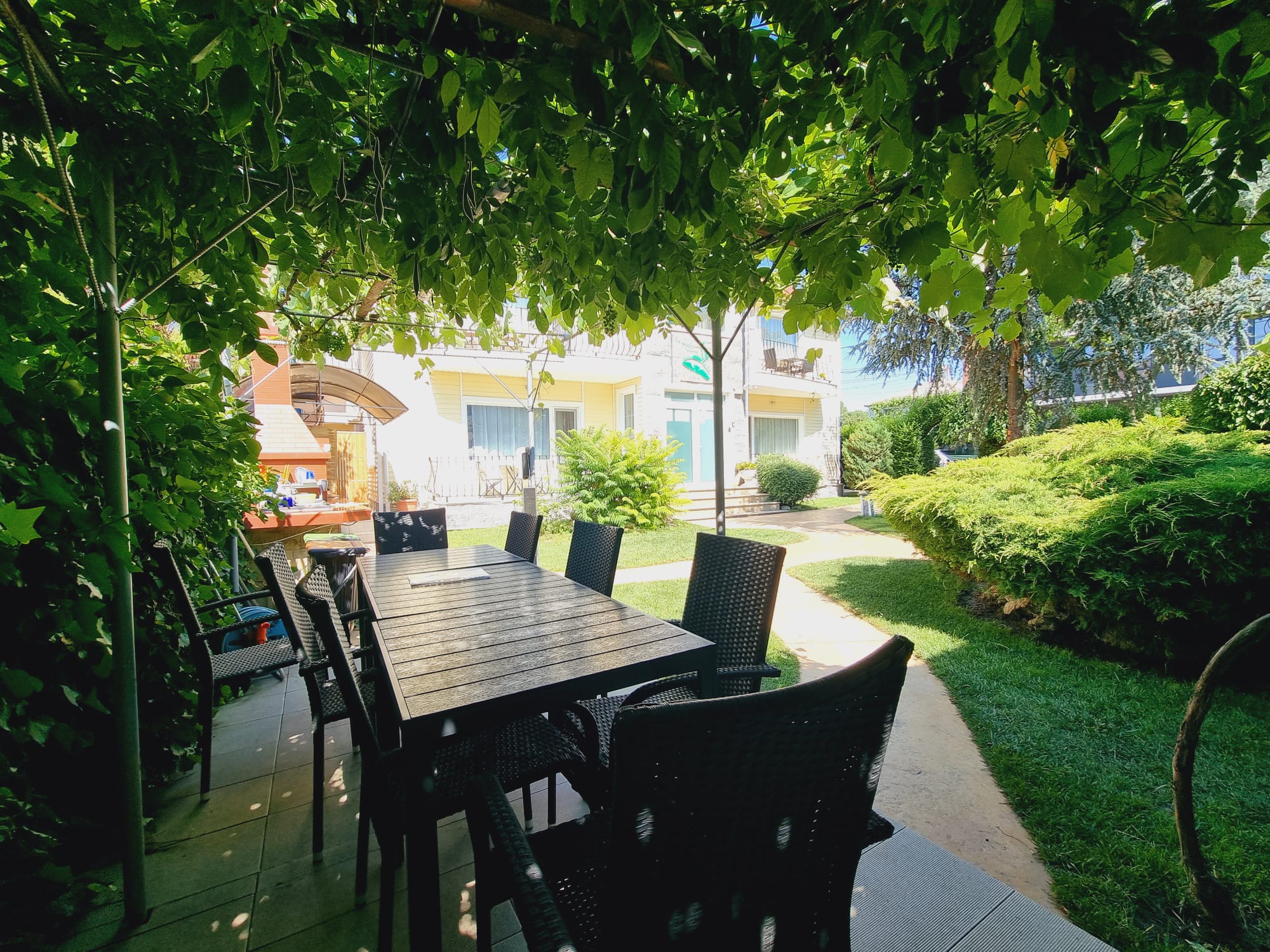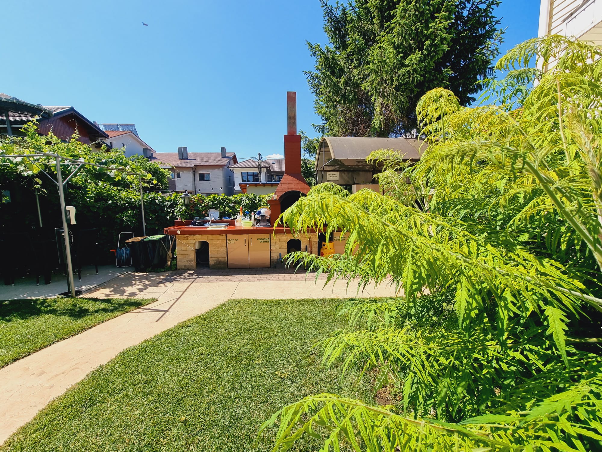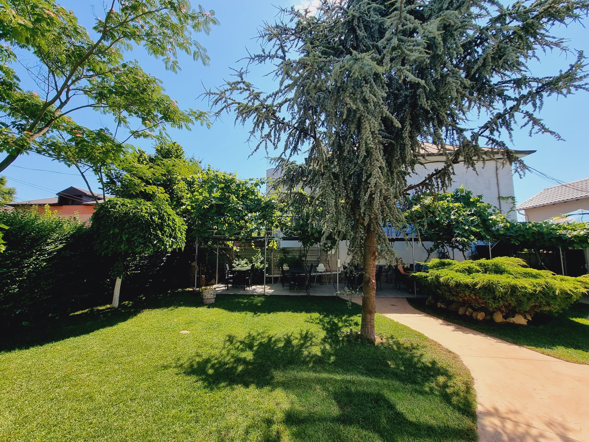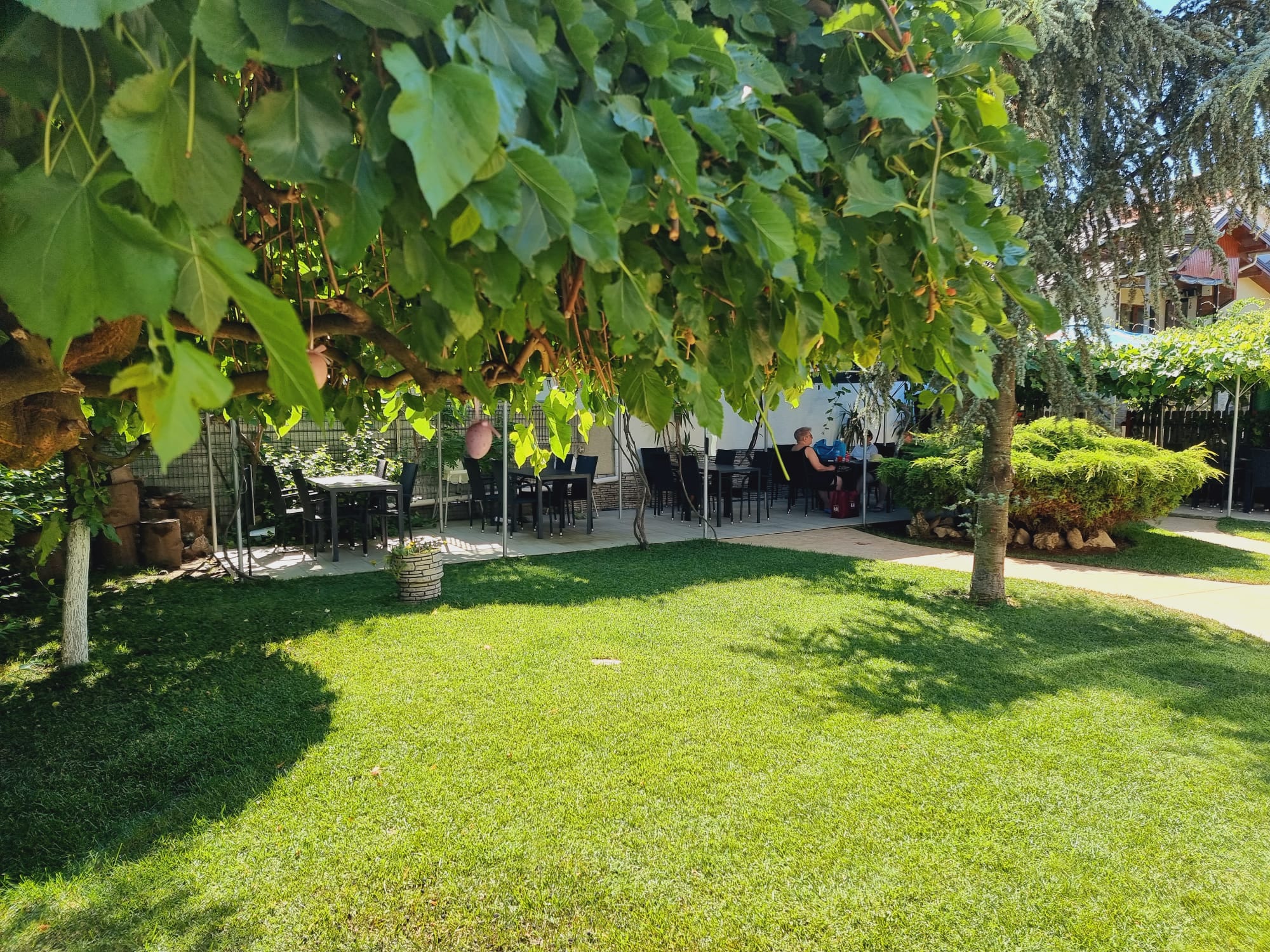 In fata vilei este amenajata o gradina de 300mp. Cu gazon si plante incantatoare, in care va puteti relaxa, o bolta de vita de vie, pe una din laturi, la umbra careia sunt mese si bancute rustice, unde se poate lua masa sau servi o bere rece.