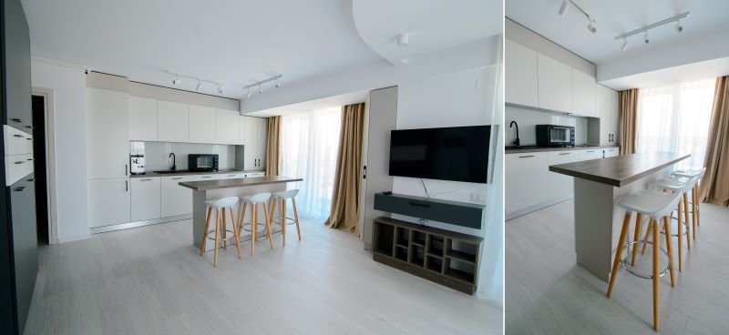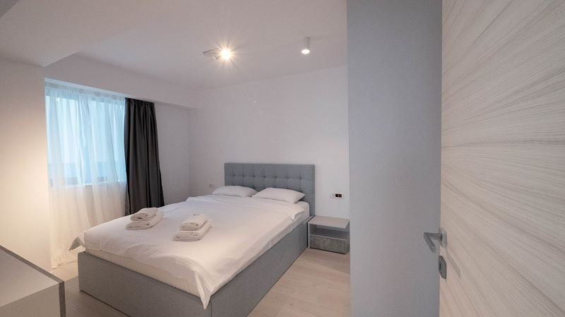 Wave 3 garsoniera (2): Garsoniera are o singura incapere spatioasa, cu un pat matrimonial si bucatarie open space. Capacitate maxima 2 persoane.