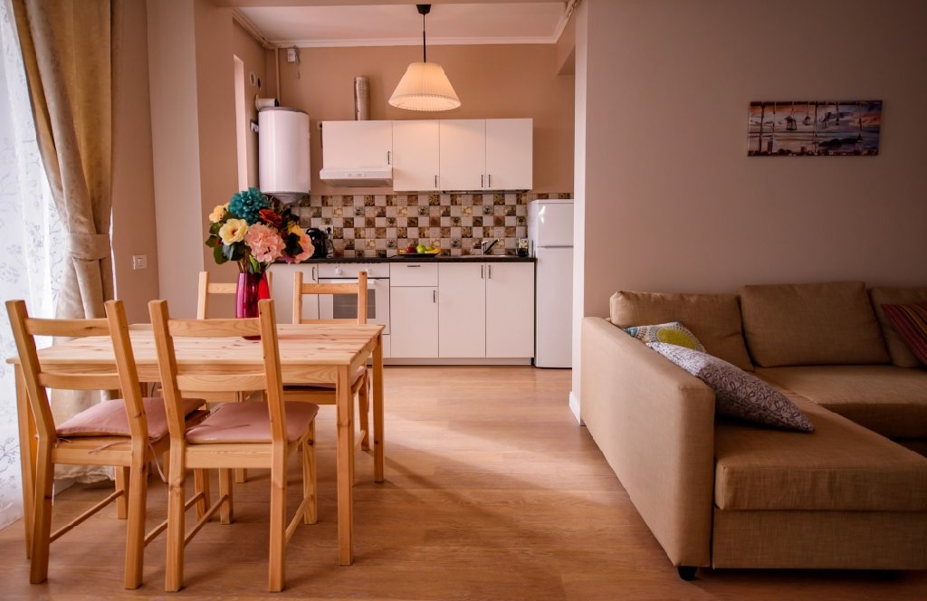 Apartamentul este format din living cu o canapea extensibila 140/200, un dormitor cu pat matrimonial 180/200 si chicineta dotata cu microunde, frigider, zona de masa, fierbator. Suprafata 45 mp.