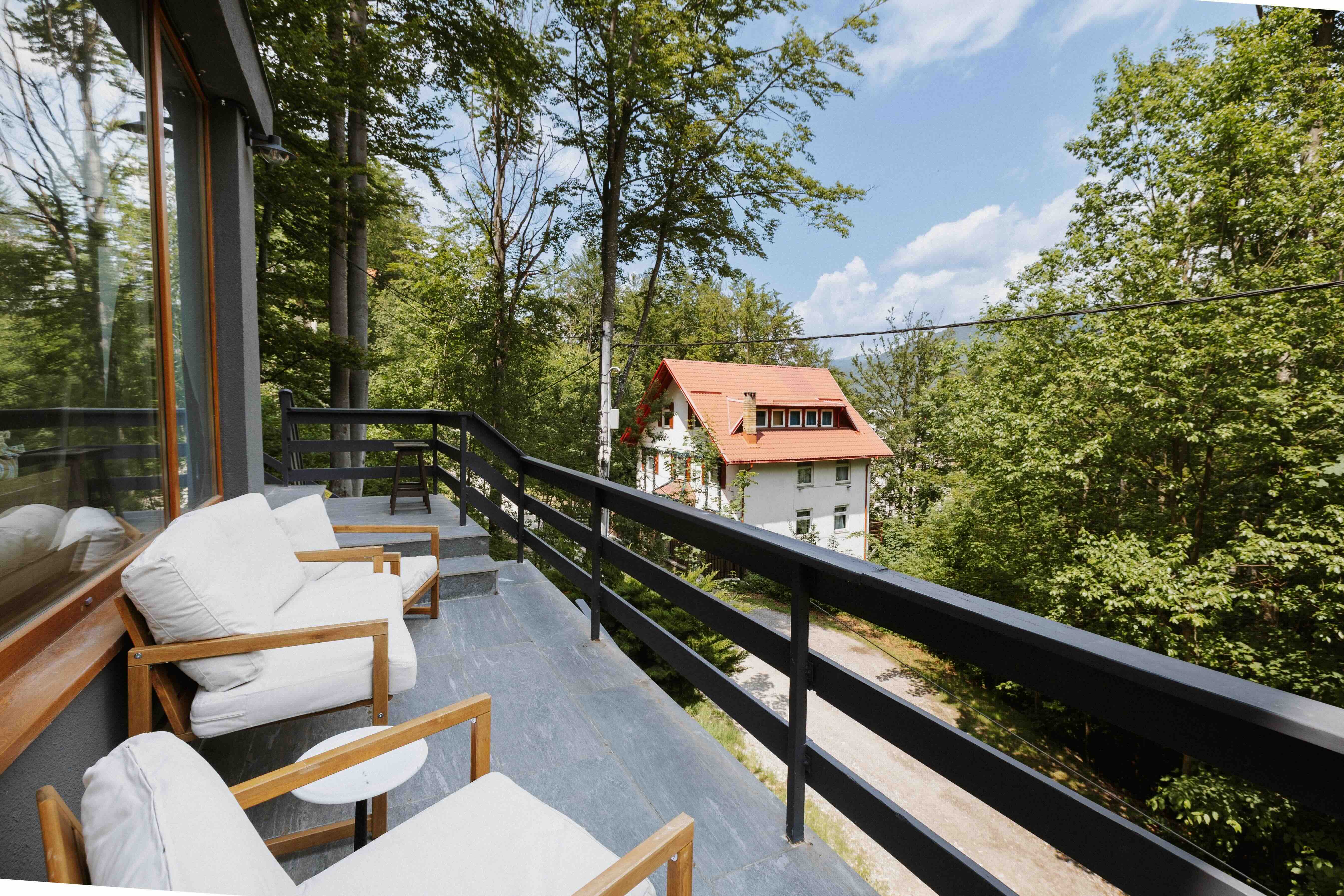 Outdoor generos: Gradina si spatii de relaxare, curte cu foisor, mobilier de gradina, loc de joaca, balcon privat, mobilat si cu vedere spre munti